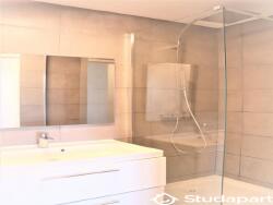 - D'une salle de bain : douche à l'italienne, lavabo, miroir, meuble,