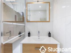 - Salle de bain : baignoire, miroir, sèche serviette ainsi que des rangements