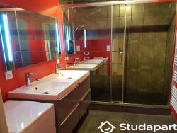 Salle de bain : large douche, meuble et évier double vasques, sèche serviette, étagères de rangement permettant à chacun de disposer de son espace rangement, lave linge.