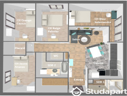 - 4 chambres individuelles avec serrures à clé unique, entièrement meublées (sommier à lattes 140x200, matelas latex, couette, oreillers, linge de lit, armoire, bureau, chaise)