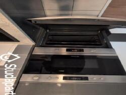 Un espace cuisine + séjour incluant une cuisine complètement équipée (plaque à induction, lave vaisselle, micro-onde, four, hotte) + table à manger avec trois chaises. Un meuble télé+ grand frigo à partager. Vaiselle fournie.