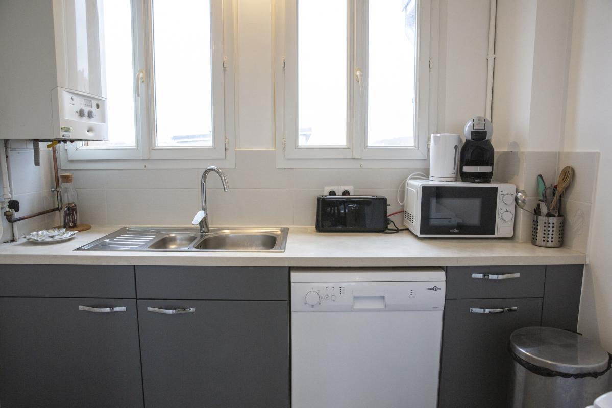 -1 cuisine équipée : plaque à induction, hotte aspirante, lave-vaisselle, four à pyrolyse, grand frigo, nombreux rangements communs et individuels, micro-onde, avec grand plan de travail.
