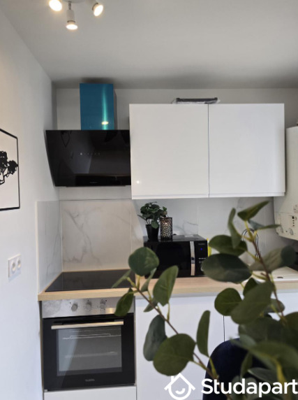 Cuisine commune équipée d'un micro onde, d'un frigo/congélateur combiné, de plaque à induction, d'une cafetière, d'une bouilloire et d'une machine à laver.