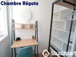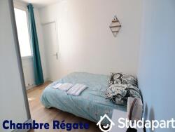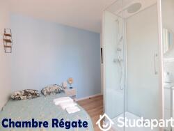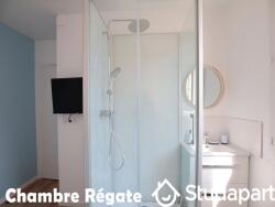 Chambre et bureau « Régate » avec douche 100x80 privative, meuble vasque, lit 120x190 de qualité avec matelas haute densité, table et lampe de chevet, TV connectée, bureau avec chaise en velour, grand dressing, radiateur à fluide caloporteur, volets ET rideaux occultants