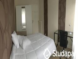 Chambre avec literie en 140 cm avec couette et 2 oreillers, table et lampe de chevet, bureau avec lampe et chaise, armoire.