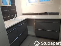 Salle d'eau avec douche, double vasque avec grand plan de toilettes sous lequel se trouvent 6 grands tiroirs pour que chaque colocataire trouve son espace.