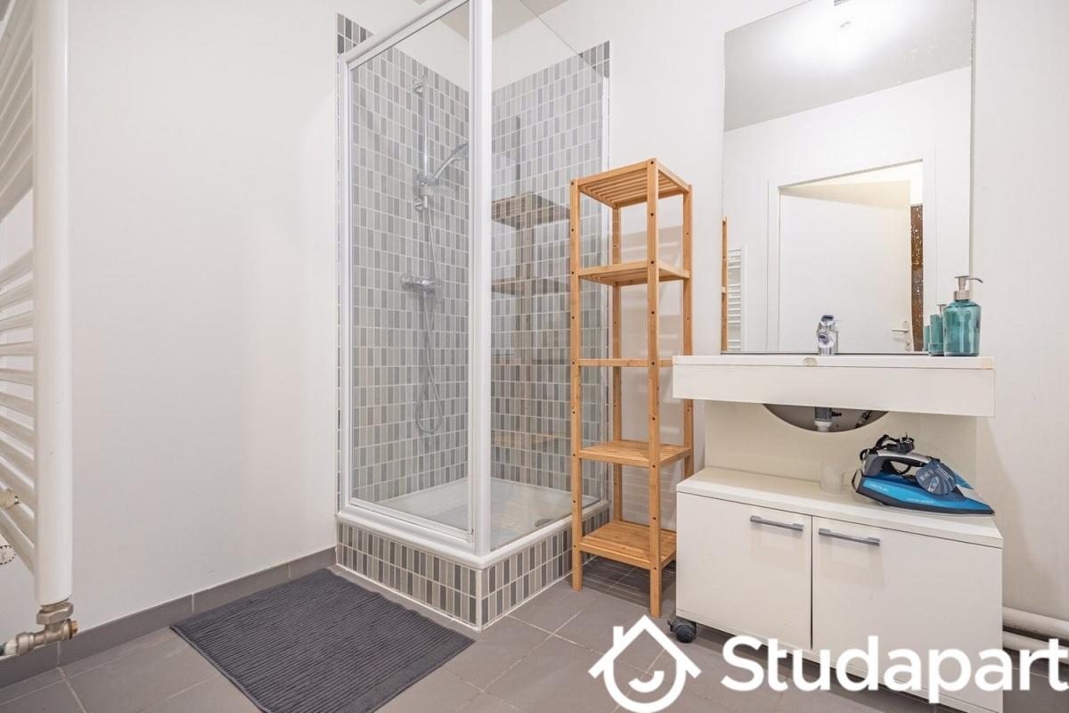 - Une salle de bain avec double vasques et rangements.