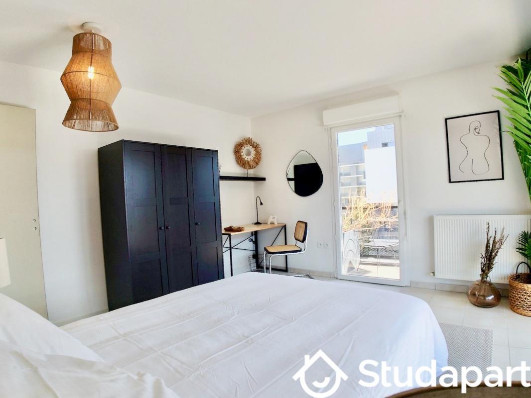 - Deux chambres avec chacune leur propre balcon, un lit 140x190, une TV, un bureau, un miroir, un grand placard aménagé avec penderie, étagères et tiroirs intégrés.