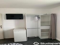 1 chambre avec lit double, bureau, placard, télévision, réfrigérateur