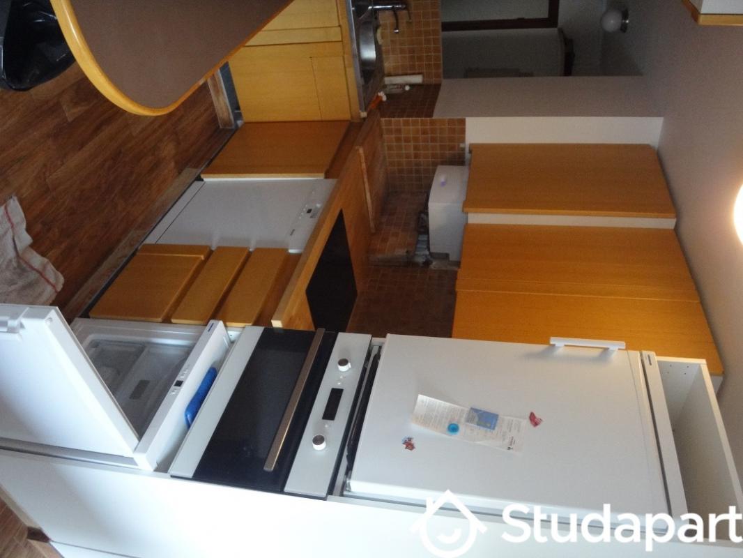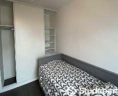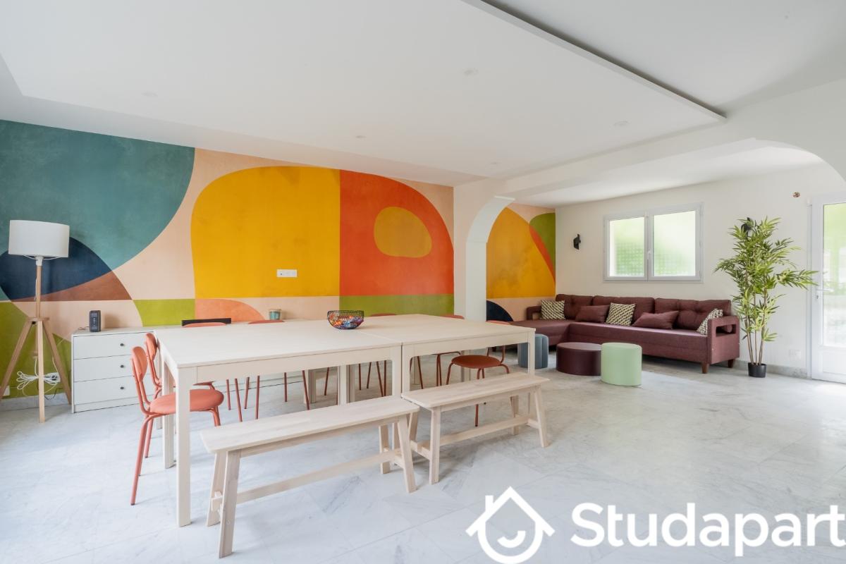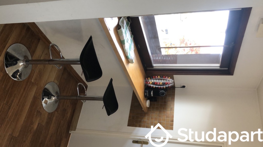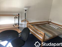 La chambre est meublée : lit 140cm, bureau, chaise roulante, rangement, éclairage, une fenêtre sans vis-à-vis, un radiateur.