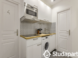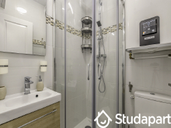 Équipements et mobilier fourni : lit banquette dépliable, armoire, table basse, bureau, chaise, télévision, réfrigérateur/congélateur, rangement chaussures, étendoir à linge, draps de lit.