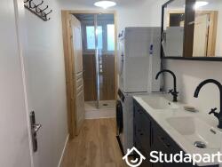 - Une salle de bain avec douche et doubles vasques, un lave-linge et sèche-linge.