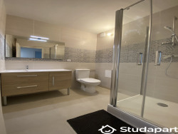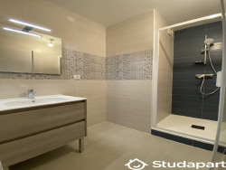L'appartement est composé d'un séjour/salle à manger, d'une cuisine équipée (lave-vaisselle, frigo, vaisselle, grille pain ...), de deux salles d'eau dont une avec WC, d'un autre WC dans le couloir.