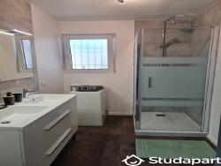 - Une superbe salle de bain avec une grande douche, un étendoir à serviette en bois, un lave-linge, un meuble vasque avec des rangements (3 compartiments), un miroir et une colonne de rangement surélevé.