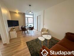 Une entrée avec un grand placard de rangement, aspirateur sans fil et étendoir à linge dessert un séjour salon-salle à manger chaleureux. Cet espace meublé dispose d'une TV et donne accès à un balcon côté parc.