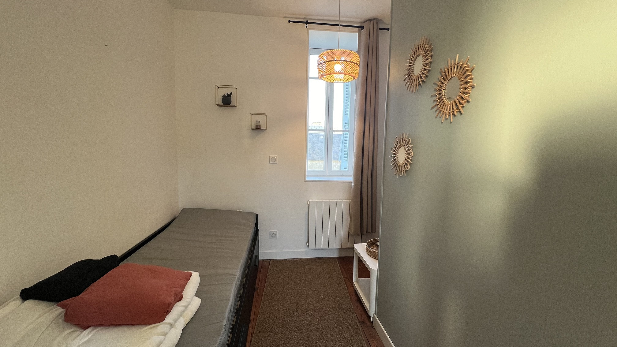 Chaque chambre est équipée d'un lit double, d'un bureau et de rangements.