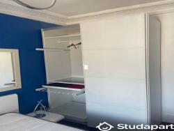 - 1 chambre tout équipée (grand placard, bureau avec chaise, lampadaire moderne, lit standard 2 places et petit frigo)