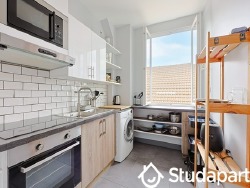 Équipements et mobilier fourni : lit double, armoire, table basse, bureau, chaise, télévision, réfrigérateur/congélateur, rangement chaussures, étendoir à linge.