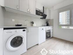 Un réfrigérateur doté d'un compartiment conservation. Une hotte aspirante avec éclairage. Une table de cuisson électrique (induction) munie de trois brûleurs. Un four à micro-ondes. Une cafetière Nespresso modèle KRUPS. Un support de rangement pour capsule à café. Une batterie de cuisine comprenant casseroles, poêles et une passoire. Assiettes non dépareillées. Verres à café. Verres. Couverts non dépareillés. Bols. Trois ustensiles : louche, spatule, grande cuillère. Trois meubles haut munis de trois portes. Deux meubles bas munis de deux portes et un tiroir de rangement à couverts. Un meuble bas pour la box internet. Un égouttoir à vaisselle. Un égouttoir à couvert Un lave-linge. Une poubelle sous évier.