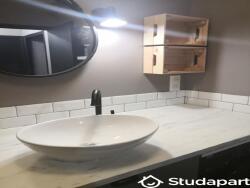 - Une salle de douche moderne avec vasque, meuble sous vasque, une machine à laver (lavante/séchante), un sèche serviettes