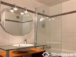 Salle de bain spacieuse avec baignoire, machine à laver et rangements individuels. Toilettes indépendantes.