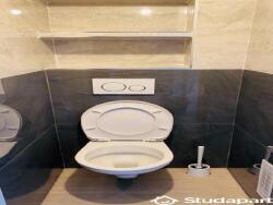 La pièce toilettes est séparée de la salle de bains qui comprend une machine à laver et une cabine de douche.