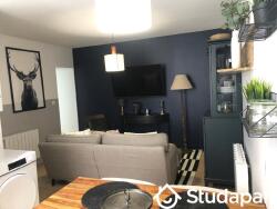 Le salon dispose d'un canapé confortable, d'une grande télévision, table basse et fauteuil.