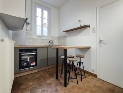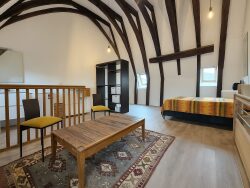 Cet appartement, entièrement meublé, est composé d'une entrée, d'un joli salon-séjour, d'une cuisine séparée aménagée et équipée (four, plaque de cuisson, micro-ondes et réfrigérateur avec partie congélateur), d'une belle chambre et d'une salle d'eau avec WC. A l'étage, une spacieuse chambre de 29m² avec espace buanderie.