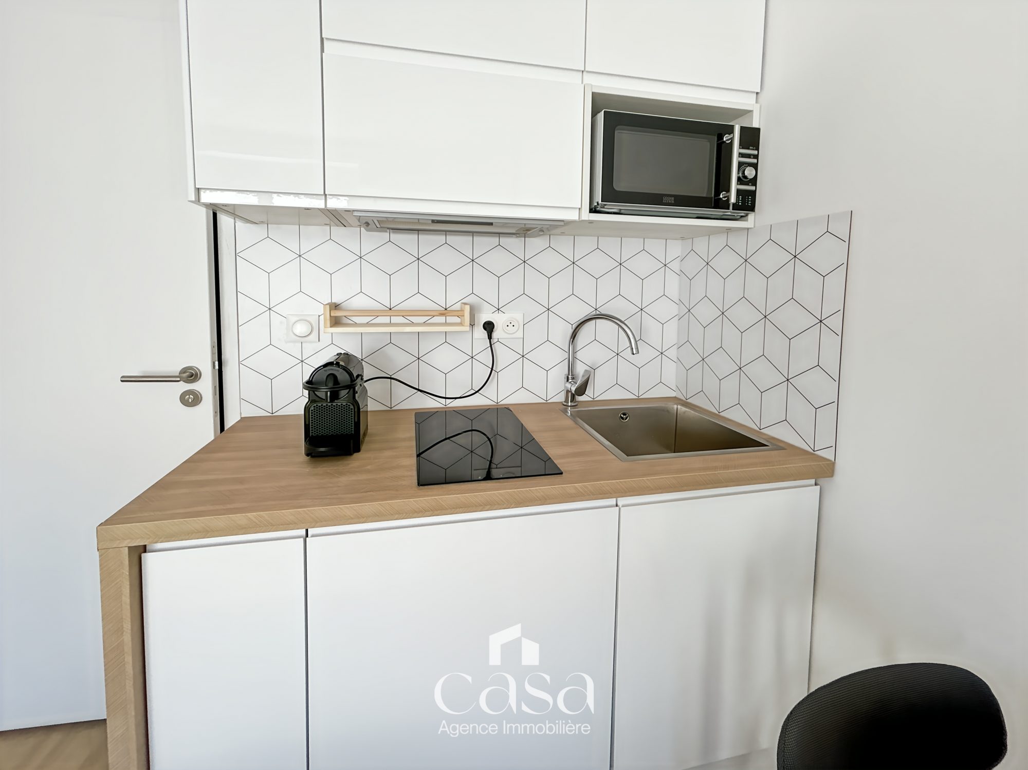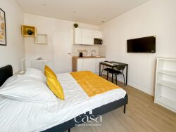 RUE PASTEUR : Un très beau studio récent et meublé qui comprend : une pièces principale avec télévision connectée, un coin cuisine aménagée et équipée (plaque, hotte, four micro-ondes, frigo), ainsi qu'une salle d'eau avec WC. Logement lumineux et très bien optimisé avec rangement et coin repas. Literie neuve et de qualité. (photo non contractuel)