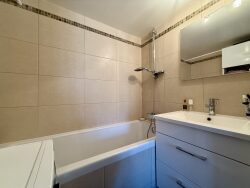 La salle de bain fonctionnelle avec baignoire dispose de branchements pour la machine à laver.