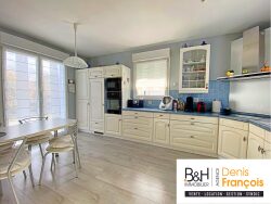 EXCLUSIVITE BH Immobilier - Agence Denis FRANCOIS Dans le quartier des Maraichers, au calme, charmante maison de 2003 de 131,5 m² habitables disposant au rez-de-chaussée : d'une entrée, d'une cuisine équipée indépendante de 16 m², d'un séjour de 31 m² avec son poêle en faïence et son accès à la terrasse de 14 m² orientée Sud-est, une chambre, une salle d'une d'eau avec douche, meuble vasque et wc A l'étage, un vaste dégagement pouvant accueillir un coin bureau dessert les 3 chambres, une remise et la salle d'eau avec douche, wc et meuble vasque. Au sous-sol de 100 m² : une buanderie/chaufferie, un espace de stockage et un double garage avec porte motorisée. Chauffage central au gaz, chaudière Wiessman de 2019 et complément par le poêle en faïence, murs isolés par l'intérieur et double vitrage PVC. Terrain de 5,62 ares disposant de 2 places de stationnement en enrobée, d'une descente de garage pavée, un potager et un jardin engazonné et arboré.