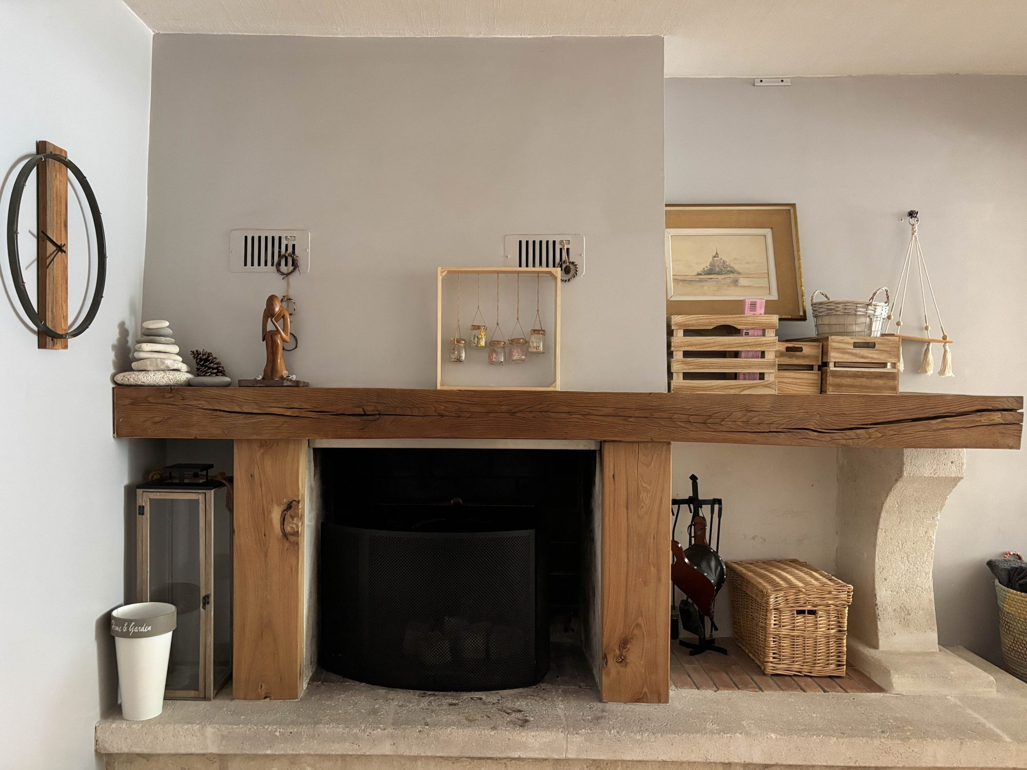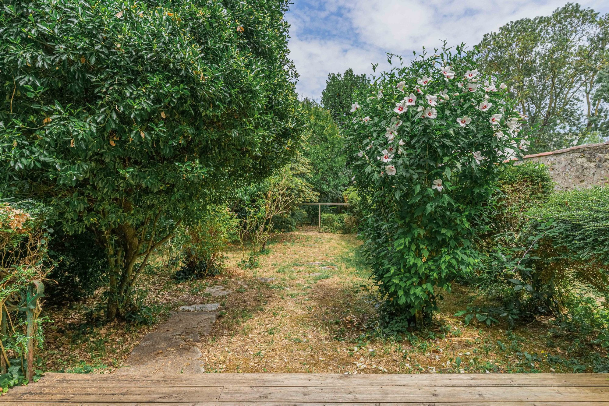 Dans le jardin, intime, clos de murs de pierres, deux terrasses prolongent naturellement le lieu de vie : l'une en pierre de taille, élégante, l'autre en bois, plus intime.