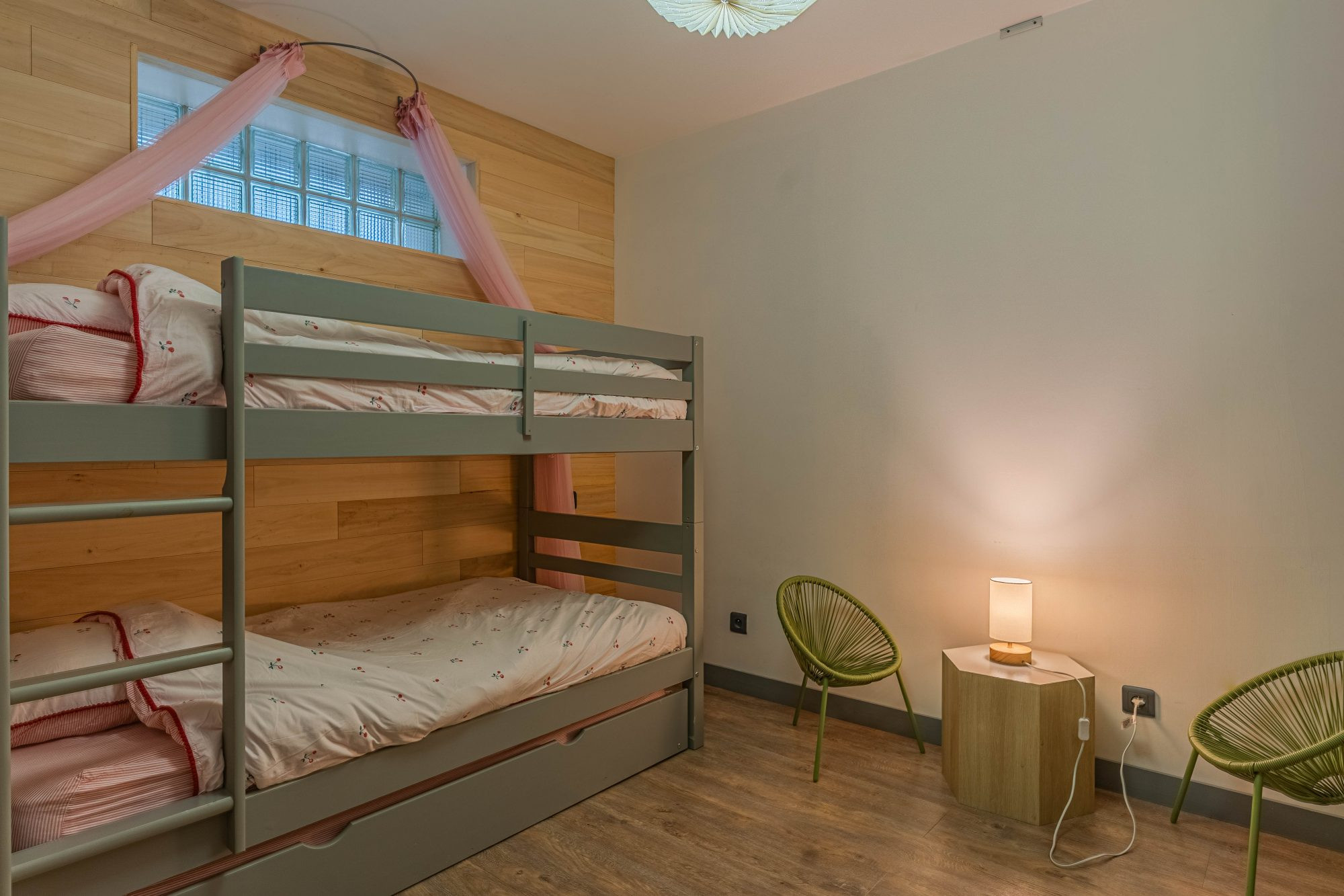L'étage s'organise autour de deux espaces : d'une part, une grande suite parentale avec salle de bains, dressing et WC ; d'autre part, 3 chambres dont 2 jumelles avec mezzanines, une salle d'eau avec double vasque et un WC indépendant. Au dernier niveau, une 5ième chambre offre un espace supplémentaire, idéal pour un adolescent ou un espace loisirs.