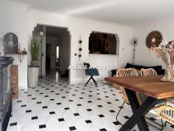 En EXCLUSIVITÉ :Charmante maison de ville pleine de cachet 4 pièces à 200 m de la plage Idéalement située à seulement 200 mètres de la plage et au pied des commerces, cette ravissante maison de ville en R+2 vous séduira par son caractère et ses beaux volumes. Au rez-de-chaussée : Une entrée accueillante dessert un vaste garage de 77 m2, offrant de nombreuses possibilités de rangement ou d'aménagement. Un ascenseur privatif y a été installé, permettant un accès au premier étage. Vous profitez également d'un agréable patio de 22,90 m2, parfait pour des moments en extérieur à l'abri des regards. Au premier étage : Vous découvrirez une belle pièce de vie lumineuse, agrémentée d'une cheminée et ouvrant sur un balcon exposé sud-est. La cuisine semi-ouverte, fonctionnelle, est reliée au séjour par un passe-plat. Ce niveau comprend également une salle de bains, un WC indépendant, ainsi que deux chambres au calme avec balcon exposé nord-ouest. Au deuxième étage : Un vaste espace de 39,63 m2 s'offre à vous, à aménager selon vos envies (suite parentale, bureau, espace détente...). Actuellement configuré en chambre avec dressing, WC et point d'eau, il donne accès à un agréable solarium de 21,60 m2, idéal pour profiter du soleil en toute tranquillité. Les + :