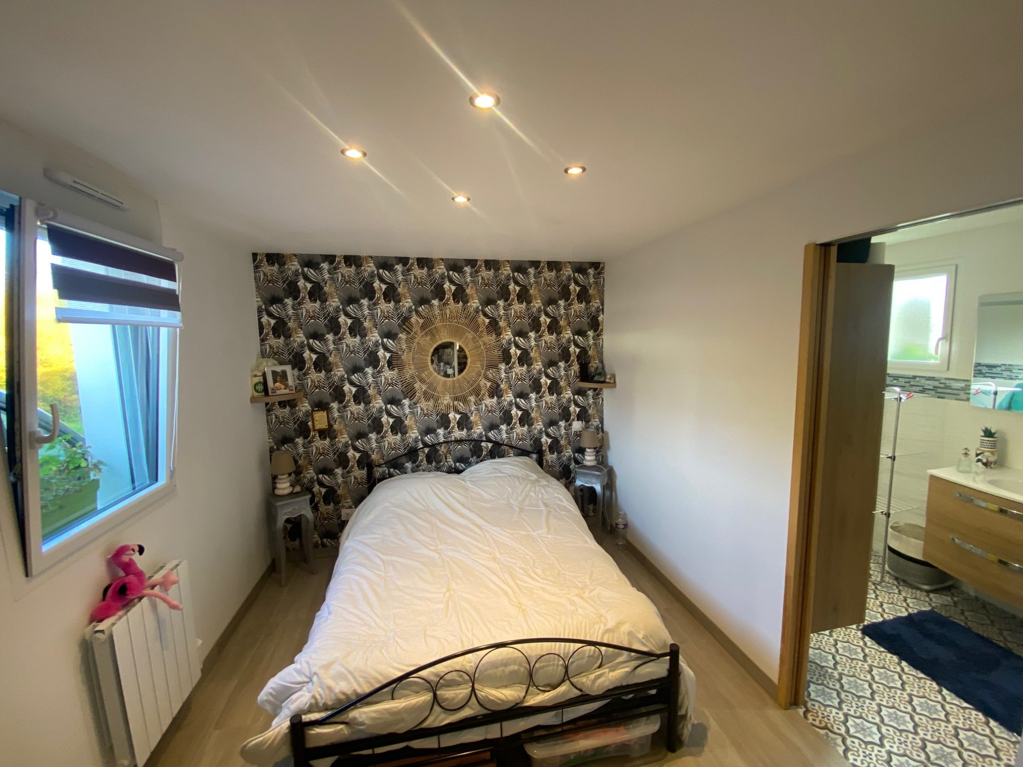 Une chambre principale spacieuse, très lumineuse, avec rangements intégrés.