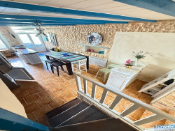Érigée sur 2 niveaux en plein centre bourg et au calme dans une petite impasse, la maison offre une surface habitable totale de 61,90 m2 organisée de la façon suivante : - RC : séjour avec cuisine équipée de environ 26,50 m2, salon media de 13,40 m2 - Étage : chambre de 14,70 m2 avec une jolie cheminée en pierres décorative (non fonctionnelle), salle d'eau avec cabine de douche, WC, lavabo et placard, palier de environ 4,40 m2.