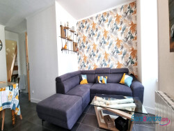 Une lumineuse pièce de vie en rdc avec espace cuisine aménagé, une salle d'eau, un toilette indépendant. A l'étage deux chambres et un bureau.