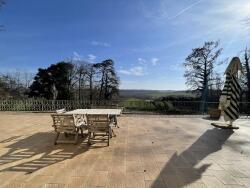 Ici aussi, on accède à la grande terrasse qui s'étend sur toute la longueur de la façade de la maison et qui offre une vue panoramique sur le parc du château et la vallée. C'est l'endroit idéal pour s'asseoir et siroter un apéritif le soir en observant les oiseaux s'envoler dans le ciel au-dessus des collines.
