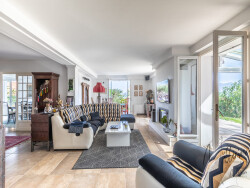 En position dominante avec vue sur les montagnes, la Nivelle et l'océan, belle néo basque de plus de 230m2 avec garage, studio indépendant et terrain de tennis au fond d'une impasse, au calme.