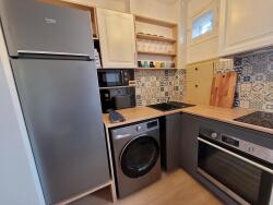 Equipée d'un réfrigérateur/congélateur, d'un four à pyrolyse, d'une microonde, d'un lave-linge séchant, de plaques induction, du nécessaire de cuisine, d'un grille-pain, d'une cafetière Philips Senseo, des meubles de rangement et de la vaisselle.
