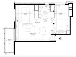 L'appartement se compose d'un vaste séjour/cuisine d'environ 31 m² ouvrant sur une terrasse de près de 8,5 m² offrant un véritable prolongement extérieur de la pièce de vie. Deux chambres bien proportionnées (environ 14,6 m² pour la première et 11,2 m² pour la seconde) permettent une organisation confortable, avec des espaces jour et nuit bien distincts. Une grande salle d'eau avec WC d'environ 6,3 m² et un dégagement optimisé complètent l'ensemble, pour une superficie intérieure d'environ 60 m² bien agencée. Les ouvertures généreuses assurent une belle luminosité, tandis que la configuration du plan, très fonctionnelle, facilite l'ameublement et la vie quotidienne