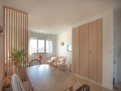 - Une entrée qui s'ouvre sur un grand salon de 30m² avec des placards de rangements. Le salon est équipé d'une télévision, d'un canapé, de fauteuil et d'une partie salle à manger. - Une cuisine entièrement équipée (lave-vaisselle, four, réfrigérateur, hotte, plaque de cuisson, micro-onde) ainsi qu'une buanderie avec machine à laver et sèche linge. - Un couloir dessert 4 chambres avec un WC séparé et deux salles d'eau partagés.