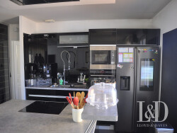 Édifiée sur un terrain plat de 734 m², elle se compose d'un spacieux séjour double avec cuisine américaine aménagée et entièrement équipée, idéal pour les moments de convivialité. Une salle de jeux ou salle télé attenante complète cet espace de vie lumineux.