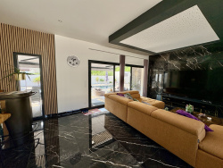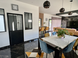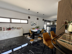 Située dans une petite commune à 12min de LANGON, 47 min de BORDEAUX et 12 min de la gare de CERONS. Très belle contemporaine de 2023. Dans un quartier résidentiel au calme, de plain-pied, elle est composée d'une véritable entrée donnant sur une très grande pièce de vie avec coin salon, salle à manger et cuisine parfaitement aménagée et équipée. D'une côté de la maison, vous trouverez la suite parentale avec bureau, chambre, grand dressing, wc et salle d'eau. De l'autre, 2 chambres, une salle d'eau et un wc. Attenant à la cuisine, un cellier donnant sur un double garage de 53m2 et un carport. Equipée de climatisation réversible, cumulus thermodynamique, micro station conforme, fibre. A l'extérieur, allée goudronnée, belle terrasse avec piscine, aucun vis à vis, pool house et cuisine d'été. Volumes, luminosité, prestations soignées, rien ne manque dans cette maison! honoraires charge vendeur. REF 4820
