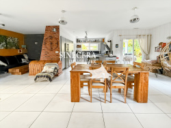 Sanguinet, dans le joli quartier boisé du Clercq, magnifique contemporaine de 2013 composée d'une belle pièce de vie triple expositions avec cuisine américaine aménagée et cellier, 3 chambres et 1 bureau dont 1 suite parentale avec dressing et salle d'eau et une salle de bains avec douche et baignoire. Côté extérieur, un studio de 20m2 environ avec salon, cuisine, salle d'eau et entrée indépendante. Idéal pour la famille, les amis, location airbnb ou profession libérale. Le jardin arboré et paysagé de 1550m2 environ est situé parfaitement au calme avec piscine au sel chauffée, spa, abris de jardin et grande serre. Un garage ainsi qu'un atelier attenant complète le bien, sans vis à vis. Pour les commodités, l'arrêt de bus scolaire est à 2 pas de la maison et un sentier forestier permet l'accès au centre-ville et au lac en quelques minutes à vélo. - Annonce rédigée et publiée par un Agent Mandataire -