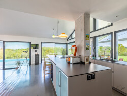 Le rez de chaussée dispose d'un vaste salon-séjour-cuisine de 130m2 rythmé par d'immenses baies vitrées s'ouvrant sur la terrasse et la piscine d'un côté et, de l'autre, une grande cuisine d'été abritée.