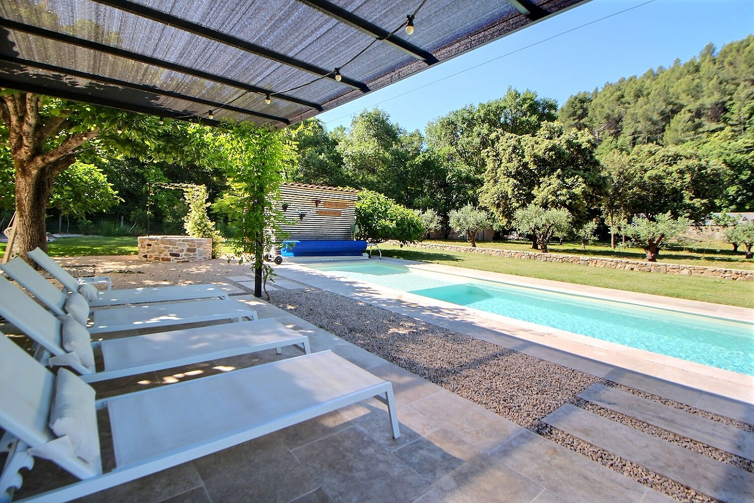 UN EXTERIEUR PROVENCAL ET CONVIVIAL Cette propriété se fond harmonieusement dans son cadre naturel. Le jardin est un havre de paix, où, oliviers, micocouliers, chênes verts, et autres sont des perchoirs naturels pour les oiseaux. Un permis construire pour une piscine de 7 x 3,5 a été déposé et validé. Possibilité de stationner un camping-car et plusieurs véhicules à l'intérieur de la propriété et 3 véhicules à l'extérieur.