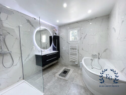 Côté nuit, 3 chambres dont une avec son dressing. Une magnifique salle d'eau moderne de 8,70 m², vous offre douche à l'Italienne, baignoire d'angle et double vasque sur un fond de carrelage imitation marbre. Des toilettes indépendantes viennent compléter cet intérieur parfaitement pensé.