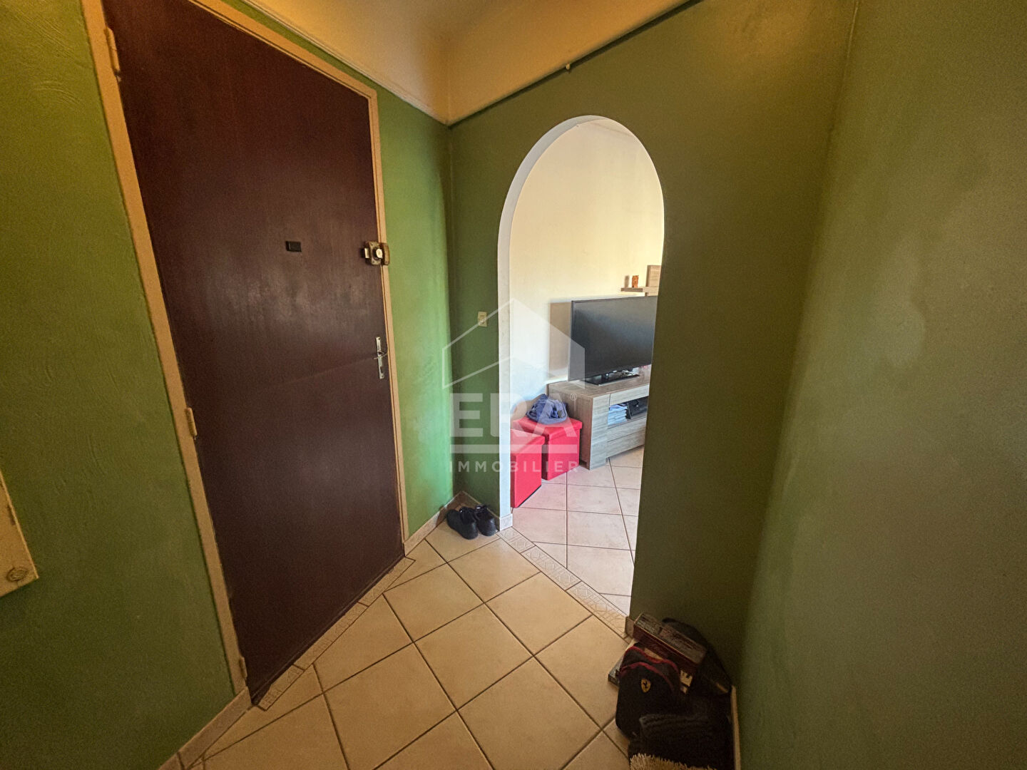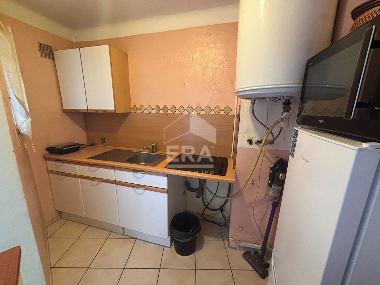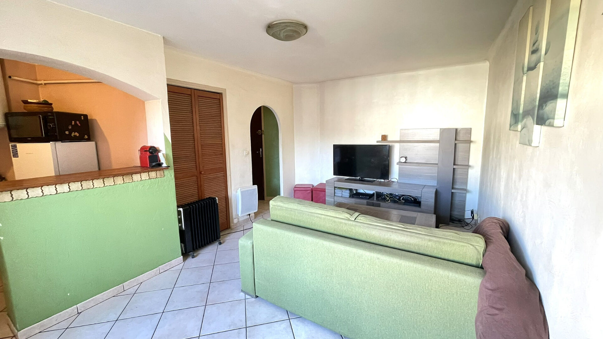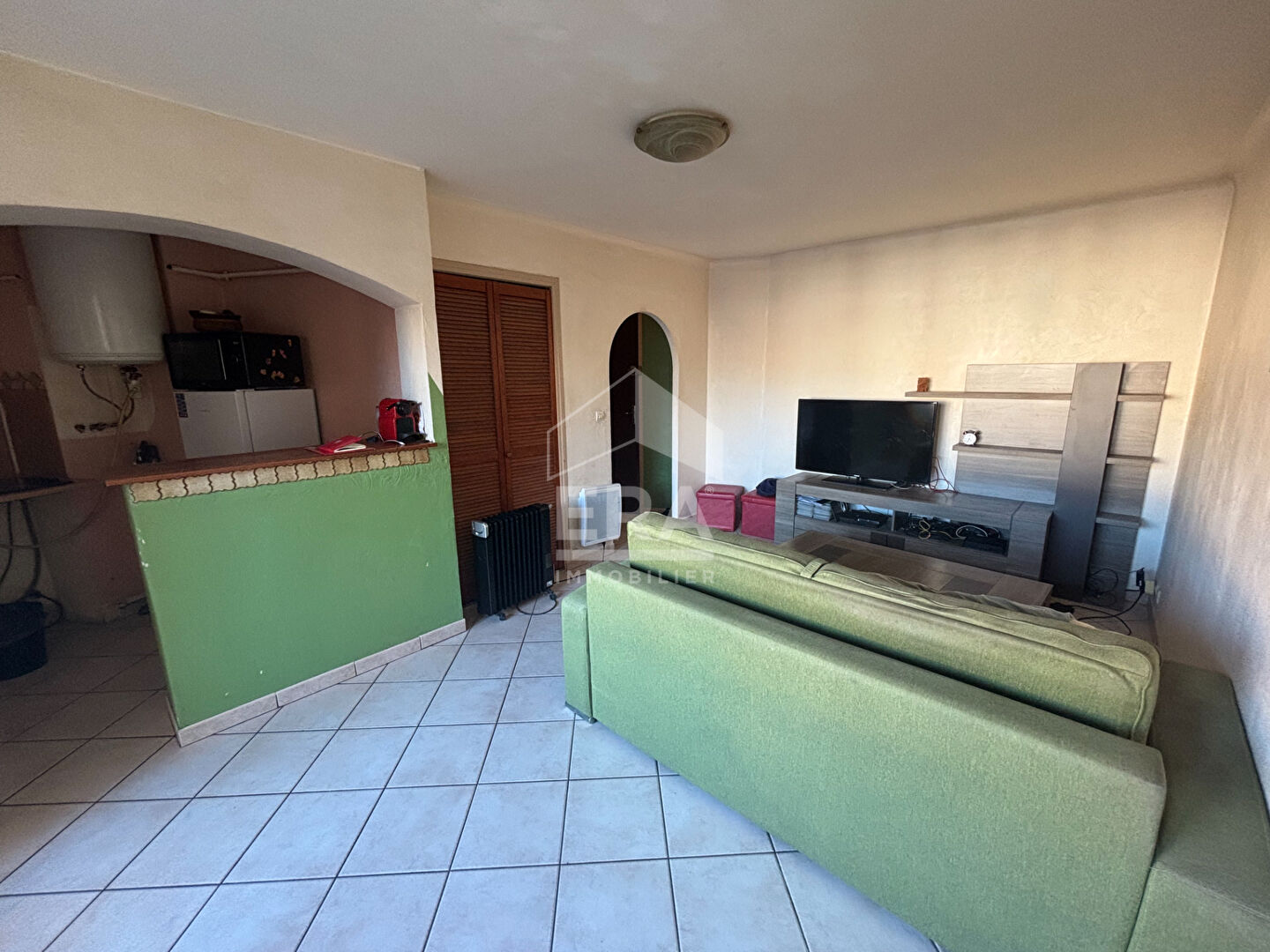 Une belle entrée, Un espace de vie lumineux ouvert sur une cuisine équipée (plan de travail en quartz, plaques vitrocéramiques, hotte, évier, frigo, vaisselle incluse). Un espace nuit Salle d'eau avec douche et WC.