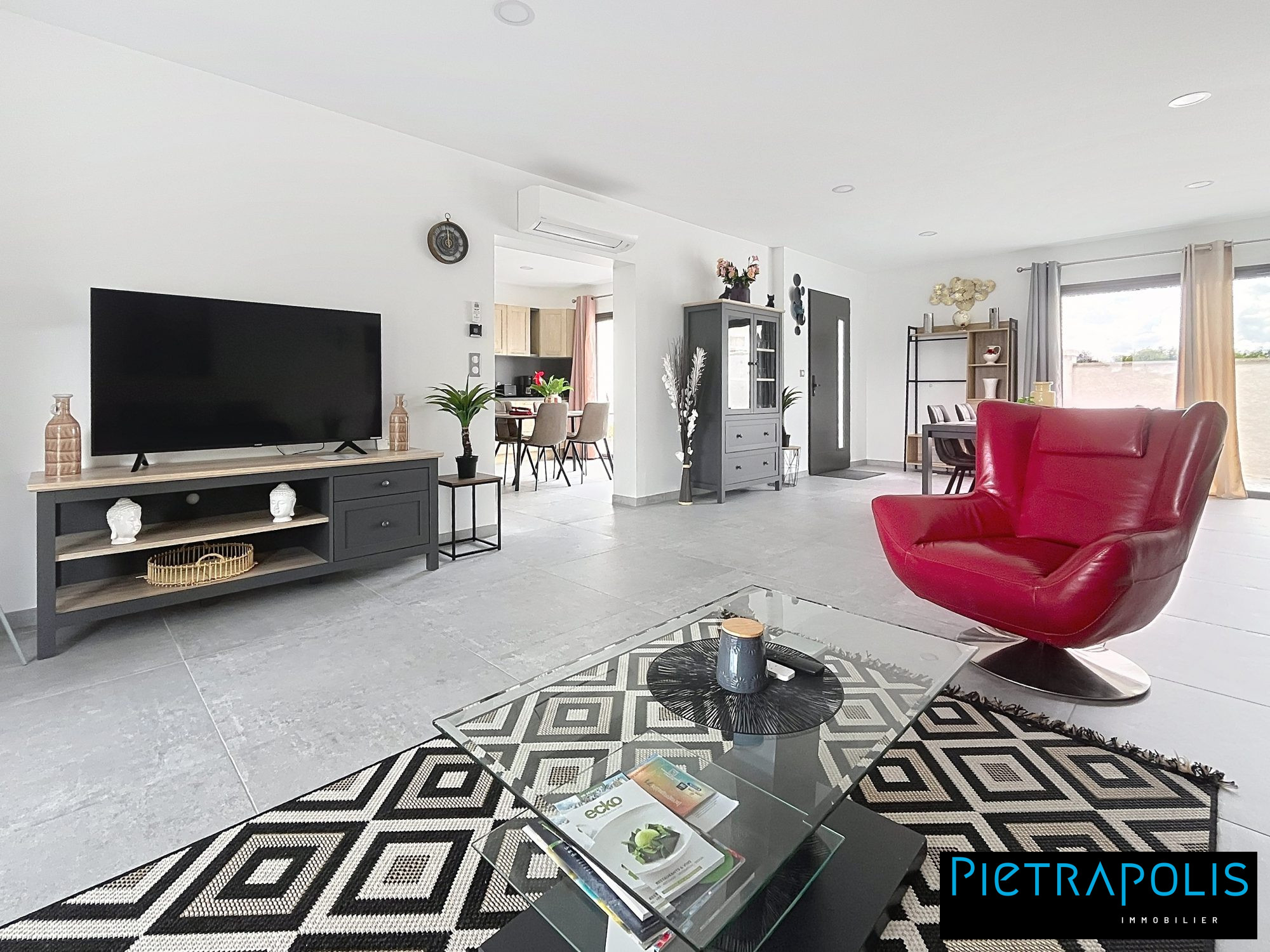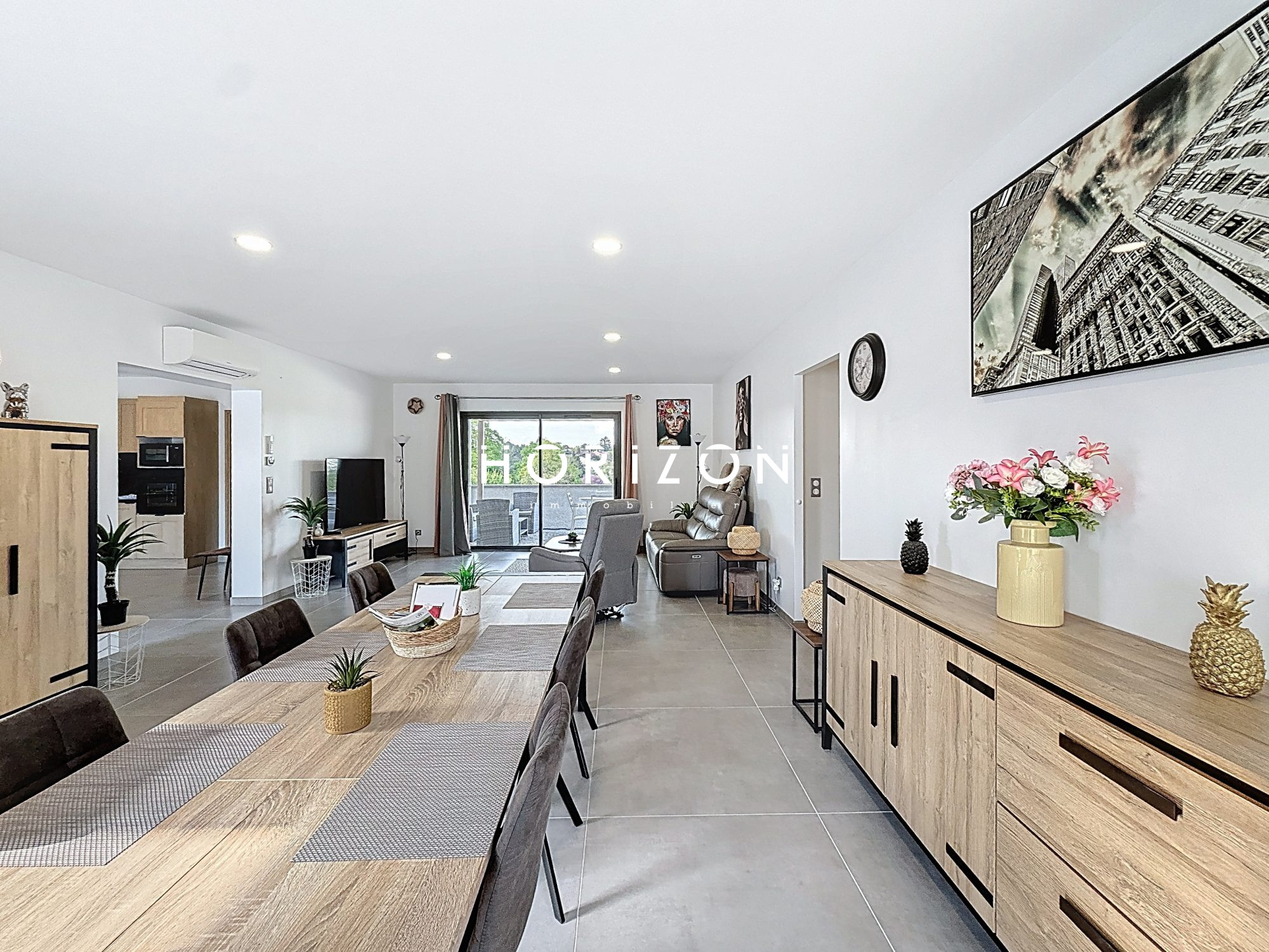 Elle se compose : D'une vaste pièce à vivre, composée de deux parties, une partie séjour avec sa grande baie vitrée d'accès à une terrasse avec vue dégagé et dans le prolongement du séjour, une grande cuisine entièrement équipée et son espace repas. Un espace buanderie de 16 m², avec une chaufferie, adoucisseur d'eau et point d'eau. La partie nuit comprend trois belles chambres : deux de 16 m² et une de 10 m². Une salle de bain familiale avec douche et double vasque, avec la possibilité d'ajouter une baignoire.